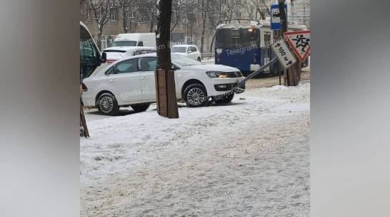В Воронеже на улице Плехановской в результате ДТП машина подмяла под себя дорожный знак. Очевидцы сообщают, что автомобиль чудом не влетел в автобусную остановку, где стояли люди. Фото и видео последствий аварии разместили в социальных сетях в среду, 21 января.