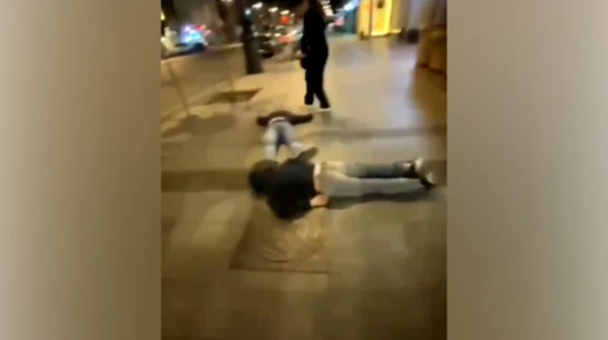 На опубликованных кадрах видно, как на тротуаре лежат трое молодых людей, а другие наносят им удары руками и ногами. Лежащие на земле не оказывают сопротивления.