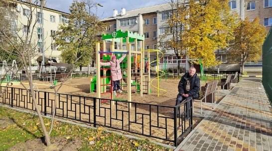 – Масштабное благоустройство началось в ноябре 2021 года. Сначала придомовую территорию освободили от аварийных деревьев, завезли песок. Затем оборудовали зону отдыха для старшего поколения, а также спортплощадку для подростков площадью 286 кв. м и игровой комплекс для малышей (площадью 550 кв. м). Установили качели и карусель, качалку-балансир, детский игровой модуль, – рассказала Ольга Подакина.