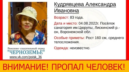 В Лискинском районе пропала 83-летняя жительница Воронежа Александра Кудрявцева в четверг, 4 августа. Женщина ушла из санатория имени Цюрупы, в котором проходила лечение, после ужина. В свой номер она больше не вернулась. Об этом корреспонденту РИА «Воронеж» сообщил руководитель поисково-спасательного отряда «Черноземье» Борис Неупокоев.