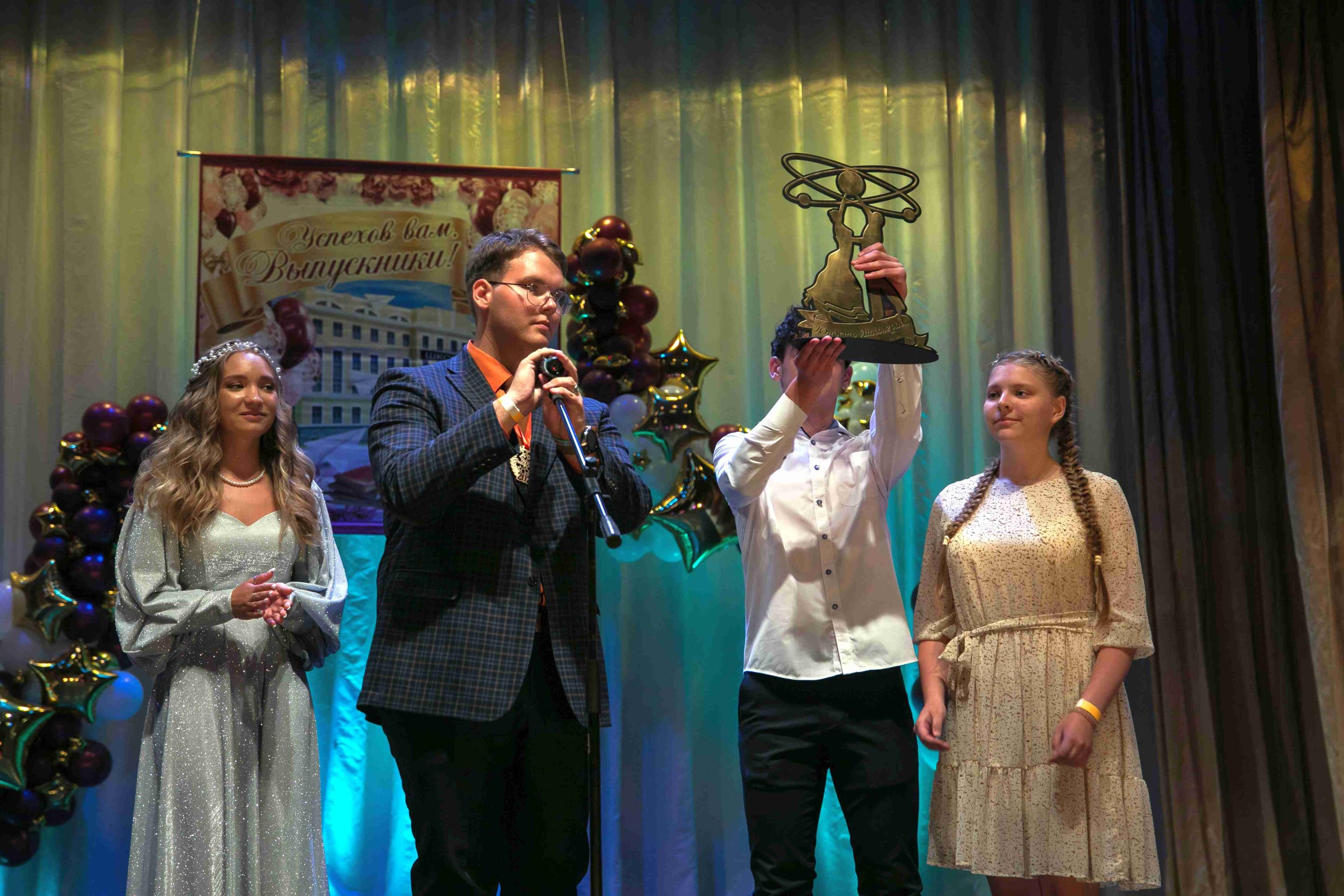 В завершении официальной части праздника выпускники 2022 года вручили будущим одиннадцатиклассникам переходящий знак – статуэтку с изображением танцующих девушки и юноши, которые держат в руках атом.