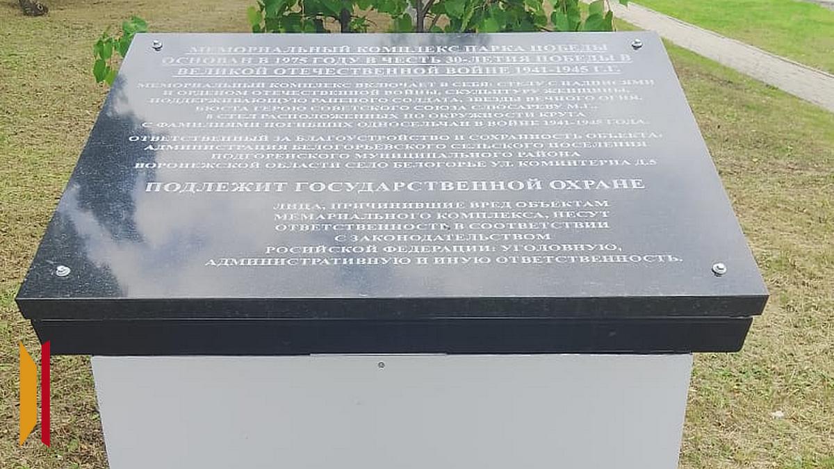 В селе Белогорье Подгоренского района завершили ремонт мемориального комплекса, расположенного в парке Победы. Субсидию в размере 1 млн 841 тыс. рублей в рамках госпрограммы выделили из облбюджета. Об этом корреспонденту РИА «Воронеж» сообщил глава Белогорьевского сельского поселения Александр Острогорский в четверг, 26 июня.