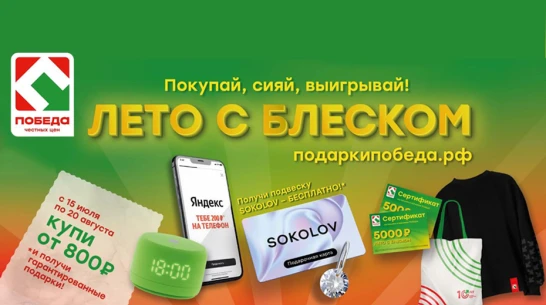 Торговая сеть ПОБЕДА запустила акцию «Лето с блеском!». Для покупателей – это возможность приобрести товары по честным ценам и выиграть ценные подарки для яркого лета. Главный приз – сертификат на 100 тыс. рублей на покупки в сети ювелирного бренда SOKOLOV.