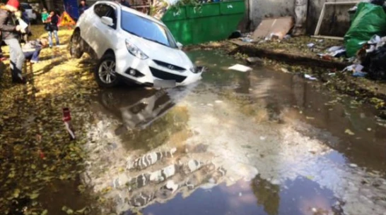 Инцидент с участием автомобиля Hyundai произошел в центре Воронежа в среду, 19 октября. Возле дома №20 на улице Плехановской машина провалилась в глубокую яму с водой. В луже погрязли левое переднее колесо автомобиля и половина заднего. Фото с места выложили в городском паблике в соцсети.