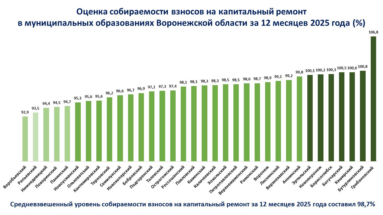 В 19 муниципальных районах Воронежской области собираемость взносов на капитальный ремонт составила от 96,2% до 99,8%. В восьми районах собственники помещений в многоквартирных домах уплатили от 92,9% до 95,6% начисленных взносов на капитальный ремонт.