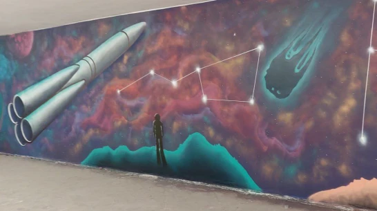 Теперь воронежцы, переходя улицу, смогут ненадолго почувствовать себя космонавтами, бороздящими просторы вселенной. Стены подземного перехода были расписаны изображениями созвездий, планет, космических кораблей и туманностей. До этого на месте рисунков была голая стена.