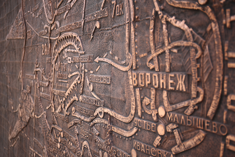 Очистку прошла и 42-метровая стела. Орден очистили и отполировали текстовую часть, но орнамент трогать не стали, чтобы сохранить форму. Теперь увидеть эту надпись можно даже с Чернавского моста. А на гранитной стене изготовили латунные декоративные элементы. Особое внимание уделили карте, где нанесен ход боевых действий в Воронежско-Касторненской операции. Из новых объектов площади – появившаяся рядом с картой надпись «Воронежский фронт». В будущем планируется сделать подсветку надписи и самой карты.