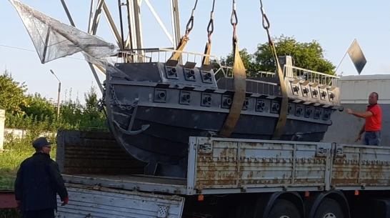 Сборку макета почти полностью завершили. Паруса корабля установят в последнюю очередь на месте, где появится памятник. Некоторые детали баркалона заменили на новые – рабочие завода заново изготовили части корабля, которые повредились из-за коррозии.