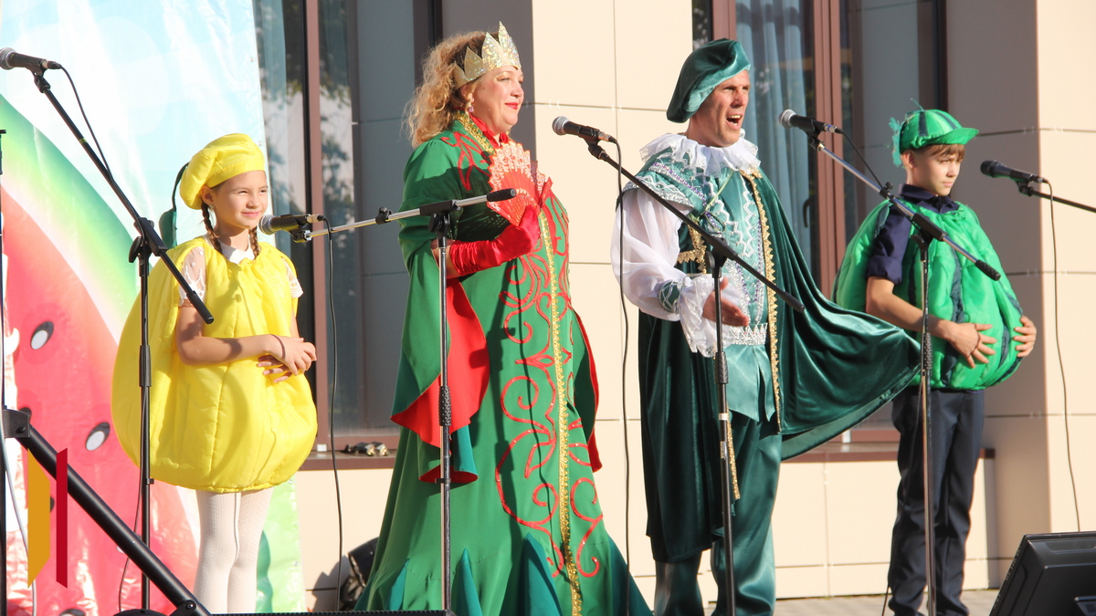 На сцену под аплодисменты зрителей вышли герои праздника – Королева, Паж, Арбузик и Дынька. Они поприветствовали зрителей и дали старт параду сельских поселений района.