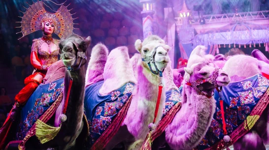 Помимо бегемотов в шоу «Песчаная сказка» выступают восемь двугорбых верблюдов. Их дрессировщики – семейная пара Екатерина Запашная и Константин Растегаев. Четвероногие артисты родом из Астрахани. В цирк верблюжат берут с четырех-пяти лет.