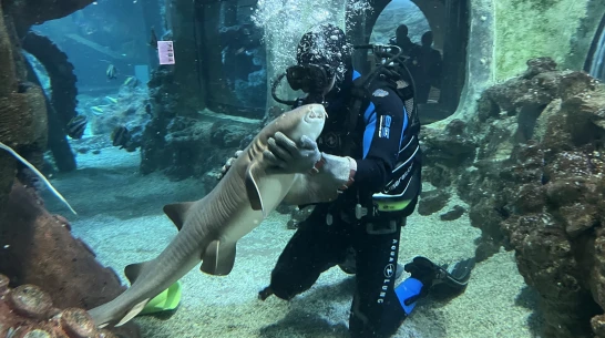 Сейчас водолазы адаптируют акулу к жизни в большом аквариуме. Новичок постепенно привыкает к присутствию человека под водой и даже дает себя гладить. Правда, только в кольчужных перчатках – это обязательное требование безопасности при работе с хищниками. В будущем зрители смогут увидеть акулу-няньку в показательных подводных кормлениях, которые ежедневно проходят в океанариуме. Исключение – понедельник: традиционный разгрузочный день у обитателей большого аквариума.
