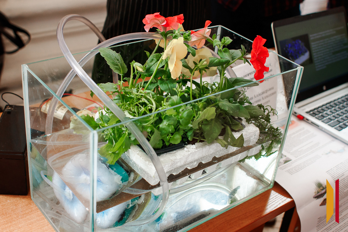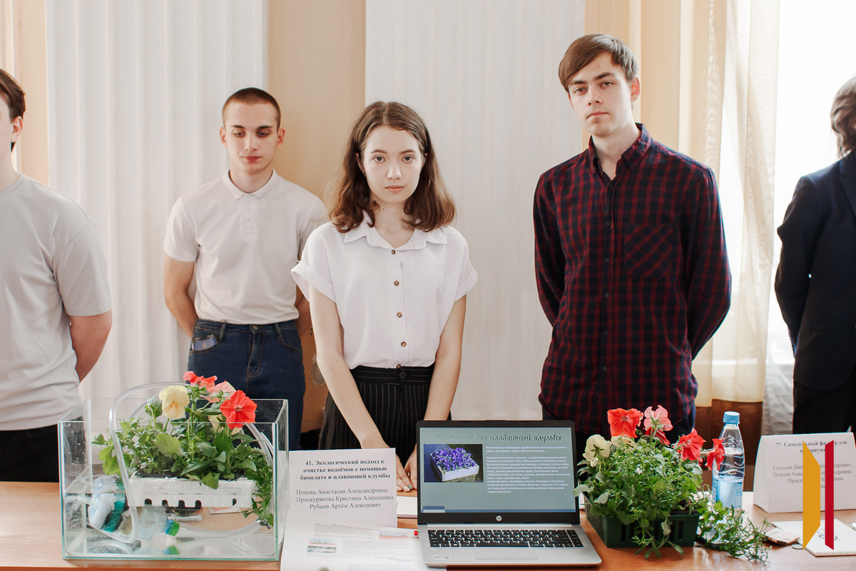 Студенты факультета инженерных систем и сооружений Анастасия Попова, Кристина Проскурякова и Артем Рубцов рассказывали гостям выставки о своей идее экологического подхода к очистке водоемов с помощью биоплато и плавающей клумбы.