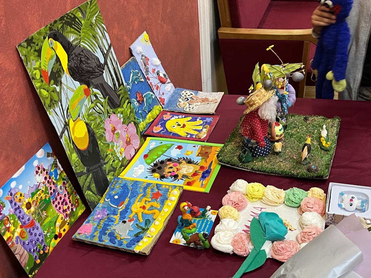 Праздник начался в фойе первого этажа. Здесь развернулась выставка декоративно-прикладного искусства – работы мам-рукодельниц, выполненные в техниках скрапбукинга, аппликации, пластилинографии.