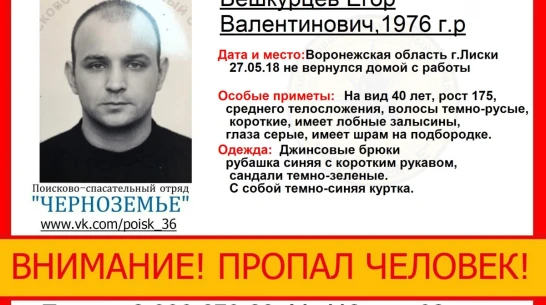 Представители поисково-спасательного отряда «Черноземье» сообщили о пропаже 42-летнего Егора Вешкурцева в среду, 30 мая. Мужчина не вернулся с работы в Лисках в воскресенье, 27 мая.
