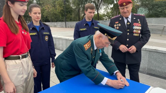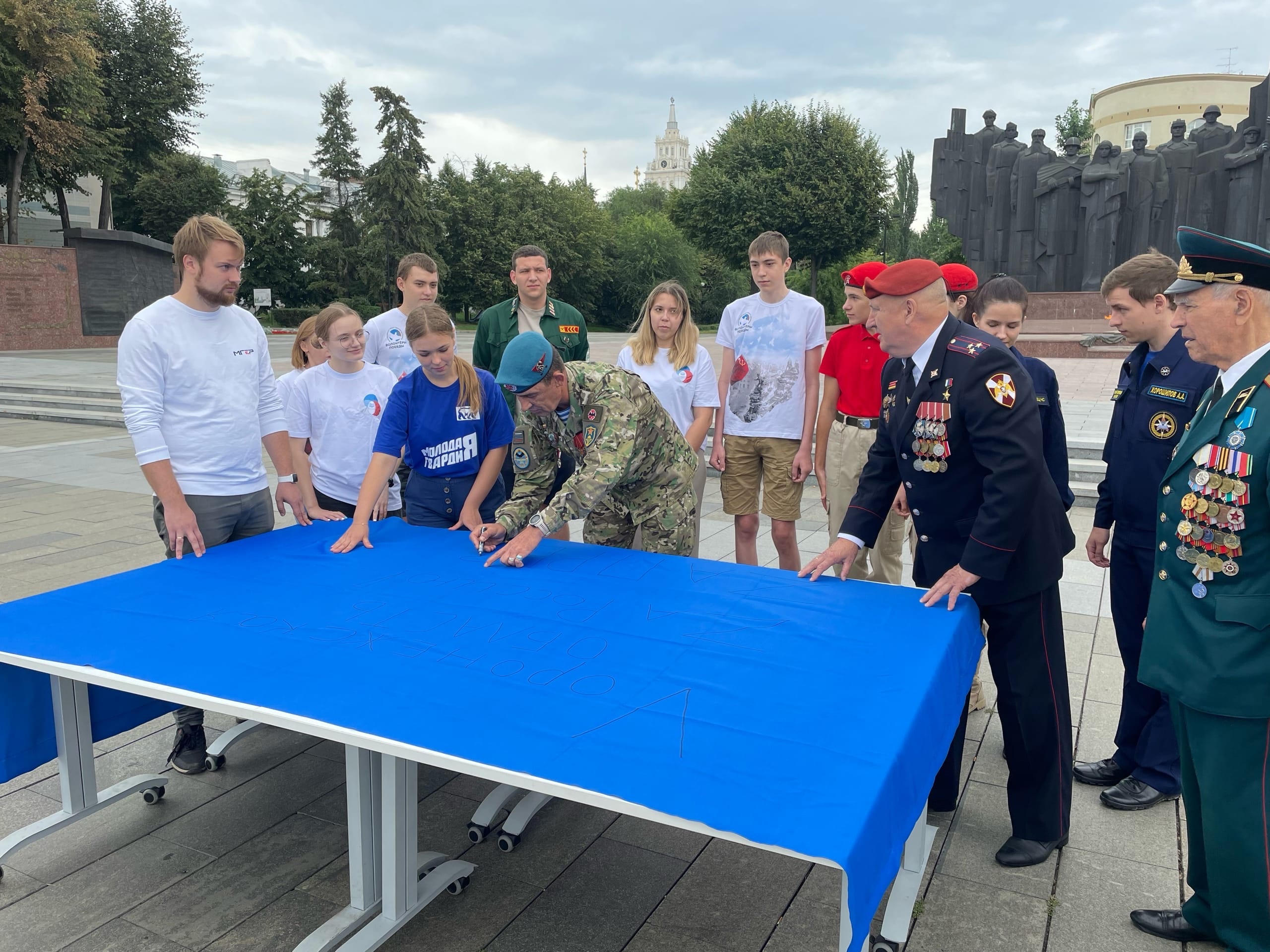 «Волонтеры Победы» и представители других общественных организаций Воронежской области, а также участники и ветераны боевых действий сделали символическую надпись на одной из 90 частей большого российского триколора. Общее знамя будет собрано из фрагментов, привезенных из всех регионов страны, а также ЛДНР, Запорожья и Херсонской области; его развернут в парке Победы на Поклонной горе в Москве в День Государственного флага РФ, 22 августа. Нанесение надписи состоялось на площади Победы в Воронеже в среду, 17 августа, сообщили в официальном сообществе «Волонтеров Победы» в соцсети «ВКонтакте».