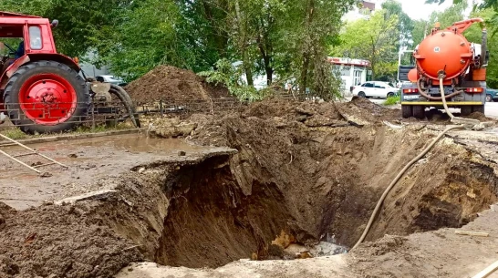 Из-за того, что котлован был заполнен водой, его стенки обрушились и засыпали трубопровод. Сейчас работать экскаватором будет сложнее, грунт напитался влагой и стал тяжелее.