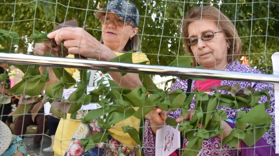 Оказалось, что плести сети очень просто. Берется основа – натянутая на рамку сеть, и на ее ячейки завязываются на узелки небольшие зеленые ленточки. Рядом волонтеры на манекене показывали приемы оказания реанимации. Тут же можно было ознакомиться с набором блюд, который волонтеры отправляют бойцам в зону СВО.