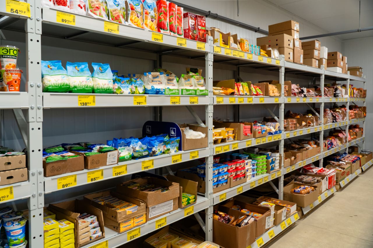Магазин работает по принципу продсклада: товары расположены в торговом зале на паллетах и стеллажах в заводских упаковках, что позволяет использовать всю площадь торговой точки, не переплачивая за выкладку и дополнительные помещения.