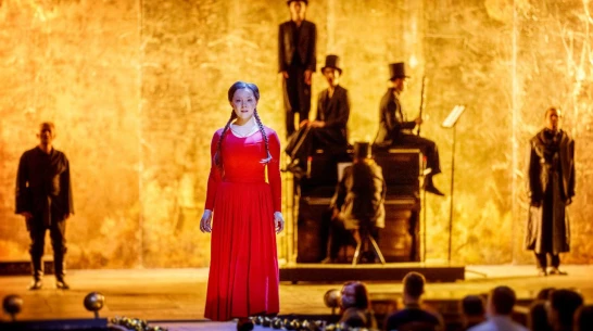 Главная декорация – темнота, откуда выплывают и куда исчезают жители города Калинова. Только сверкающие молнии озаряют глубину сцены. Все персонажи – в черных сарафанах, шляпах, плащах и рубахах. И лишь Катерина Кабанова в бьющем по глазам красном платье – всполох молнии в темном царстве. Персонажи находятся в двухмерном пространстве, их на специальных платформах вывозят на авансцену и увозят с нее. Мифический город Калинов, в нем все как бы не всерьез.