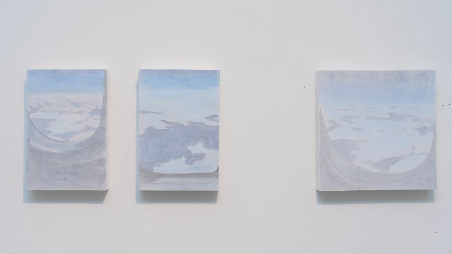 Николай Алексеев выставил десяток новых картин на гипсокартоне в белых тонах, изображающих случайные предметы, привезенные из путешествий: стул, мольберт, клетку со львом.