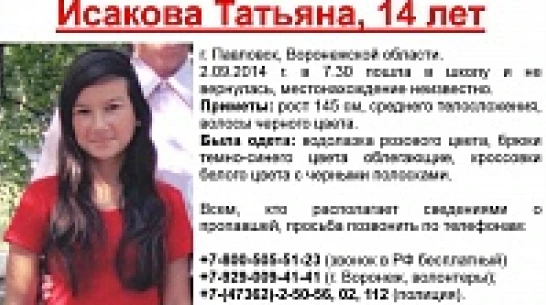 В пятницу, 5 сентября, следователи возбудили по факту безвестного исчезновения 14-летней Тани Исаковой дело. Как сообщил журналисту РИА «Воронеж» руководитель Павловского межрайонного следственного отдела СУ СКР по Воронежской области Андрей Кандеров, дело возбуждено по статье «Убийство» (ч. 1 ст. 105 УК РФ). В подобных ситуациях, когда речь идет о пропаже ребенка, появление таких дел – обычная практика. Оно вовсе не означает, что есть основания полагать, что с девочкой произошла беда. При расследовании у правоохранителей появится больше возможностей проверить все версии исчезновения школьницы. В Павловск на поиски школьницы выехали следователи из Воронежа.