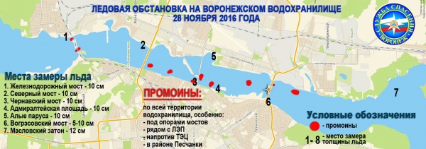 По данным спасателей, средняя толщина льда составила 10 см, на поверхности – вода. Самый толстый лед у Масловского затона (12 см), самый тонкий – у Вогрэсовского моста (5-10 см). Сотрудники службы спасения нашли промоины под опорами всех мостов, а также рядом с ЛЭП, напротив Адмиралтейской площади и в районе ТЭЦ.