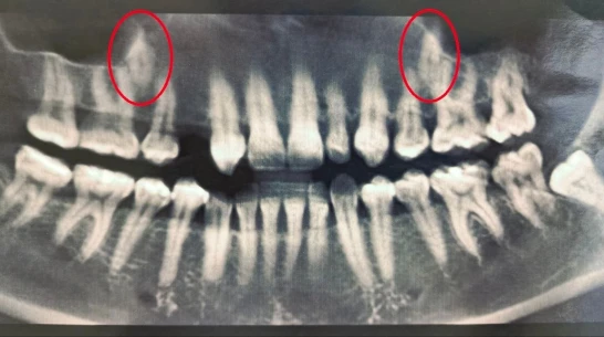 Стоматологи установили пациентке брекеты, которые та носила на протяжении полутора лет, создавая место для новых зубов. После этого врачи хирургически раскрыли коронки непрорезавшихся зубов и зафиксировали ортодонтические кнопки для их вытяжения. На данный момент благодаря специальному оборудованию один из зубов полностью вышел из костной ткани, а второй успешно прорезается.