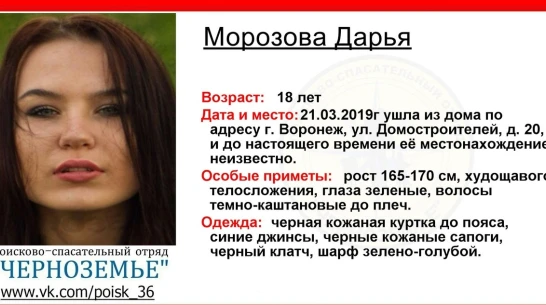 Волонтеры поискового отряда «Черноземье» начали поиски пропавшей 18-летней Дарьи Морозовой. Девушка ушла из своего дома по улице Домостроителей, 20 в четверг, 21 марта. С тех пор ее не видели.