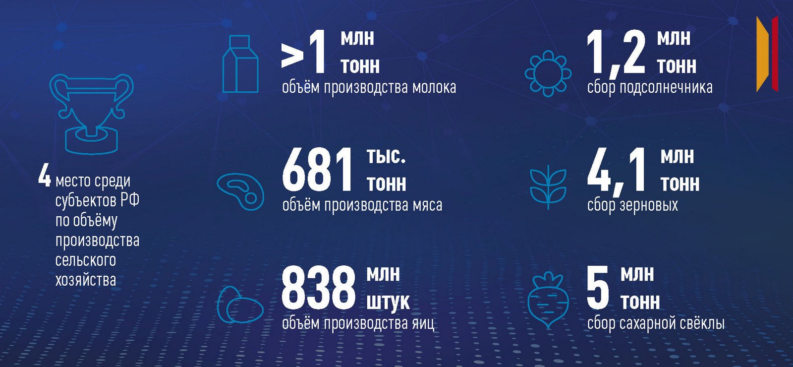 – По предварительным данным, как я уже отмечал, Воронежская область заняла четвертое место в рейтинге регионов по объемам сельхозпроизводства, даже несмотря на крайне неблагоприятные погодные условия прошлого года, негативно отразившиеся на отрасли растениеводства. Отмечу, что наш регион сохраняет лидирующие позиции в России по производству следующих видов продукции: растительного и сливочного масел – первое место (12% и 7% от общероссийского объема соответственно); кондитерских изделий – второе место (9,5% от общероссийского объема); сахара – третье место (12,5% от общероссийского объема); сыра – четвертое место (7% от общероссийского объема), – сообщил губернатор.