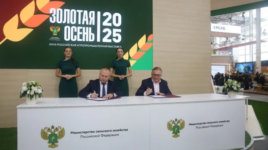 В четверг, 9 октября, на площадке выставки «Золотая осень – 2025» в Москве состоялась рабочая встреча министра сельского хозяйства Воронежской области Валерия Мелещенко с президентом Национального союза агростраховщиков (НСА) Корнеем Биждовым. В рамках встречи было подписано соглашение между министерством и НСА.