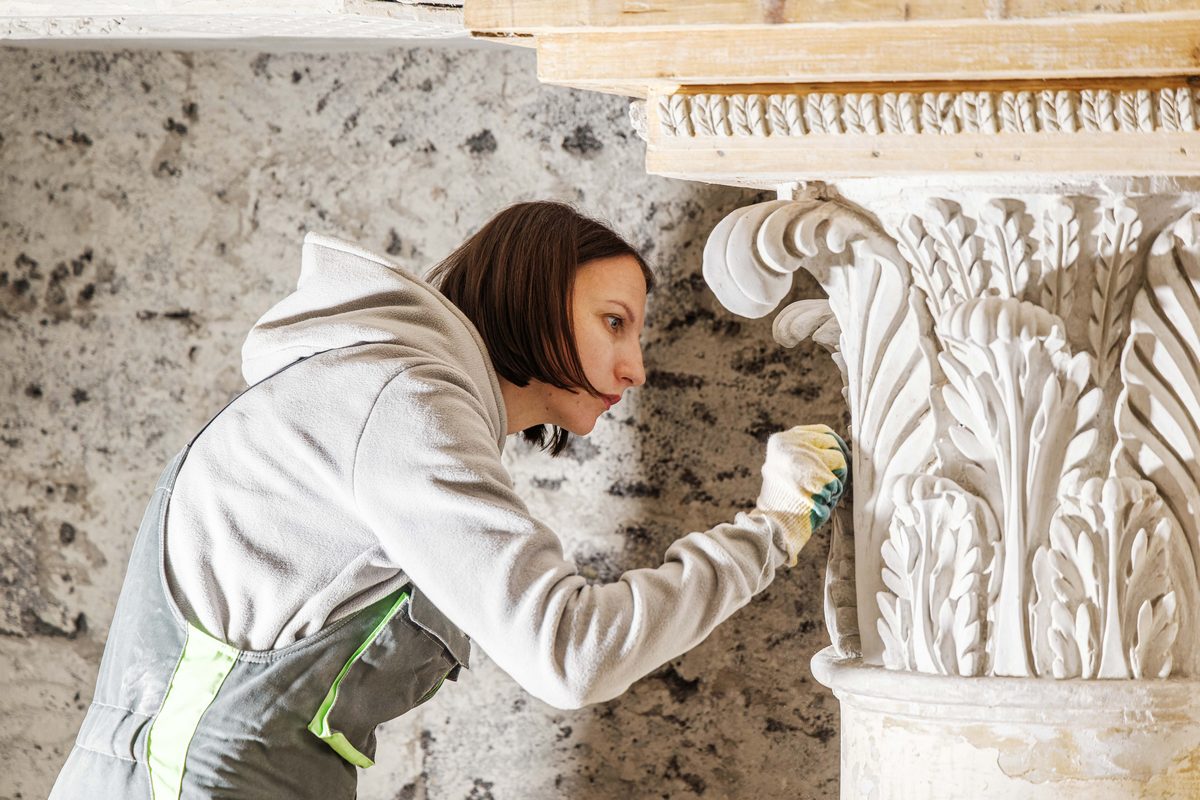 Во всем здании оштукатуривают стены, так как оригинальная штукатурка была сильно повреждена или утрачена, а в специальных образцовых помещениях проводят подготовительные работы для финального этапа реставрации. Специалисты подбирают колера для окраски стен и реставрации паркета. Цветовые решения тщательно выверяют с помощью архивных данных и натурных исследований, чтобы обеспечить максимальное соответствие историческому облику.