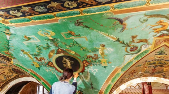 Во всем здании оштукатуривают стены, так как оригинальная штукатурка была сильно повреждена или утрачена, а в специальных образцовых помещениях проводят подготовительные работы для финального этапа реставрации. Специалисты подбирают колера для окраски стен и реставрации паркета. Цветовые решения тщательно выверяют с помощью архивных данных и натурных исследований, чтобы обеспечить максимальное соответствие историческому облику.