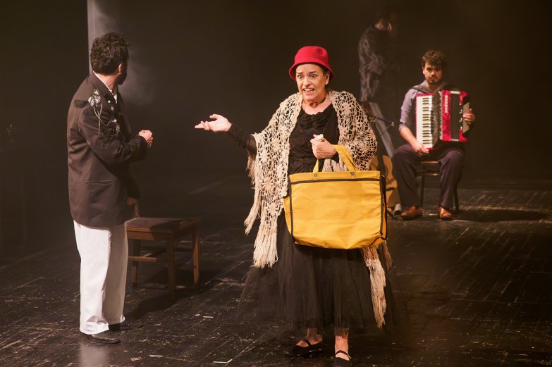 Спектакль должен начаться в 19:00, зрители толпятся в фойе, в зал не запускают. Внезапно открывается одна из дверей театра, и женщина на португальском, а иногда на русском начинает что-то кричать, просить помощи, кидается к гостям с мольбами, спускается по лестнице вниз и оказывается на месте гибели главной героини. Истошно кричавшая женщина – служанка Лукерья.