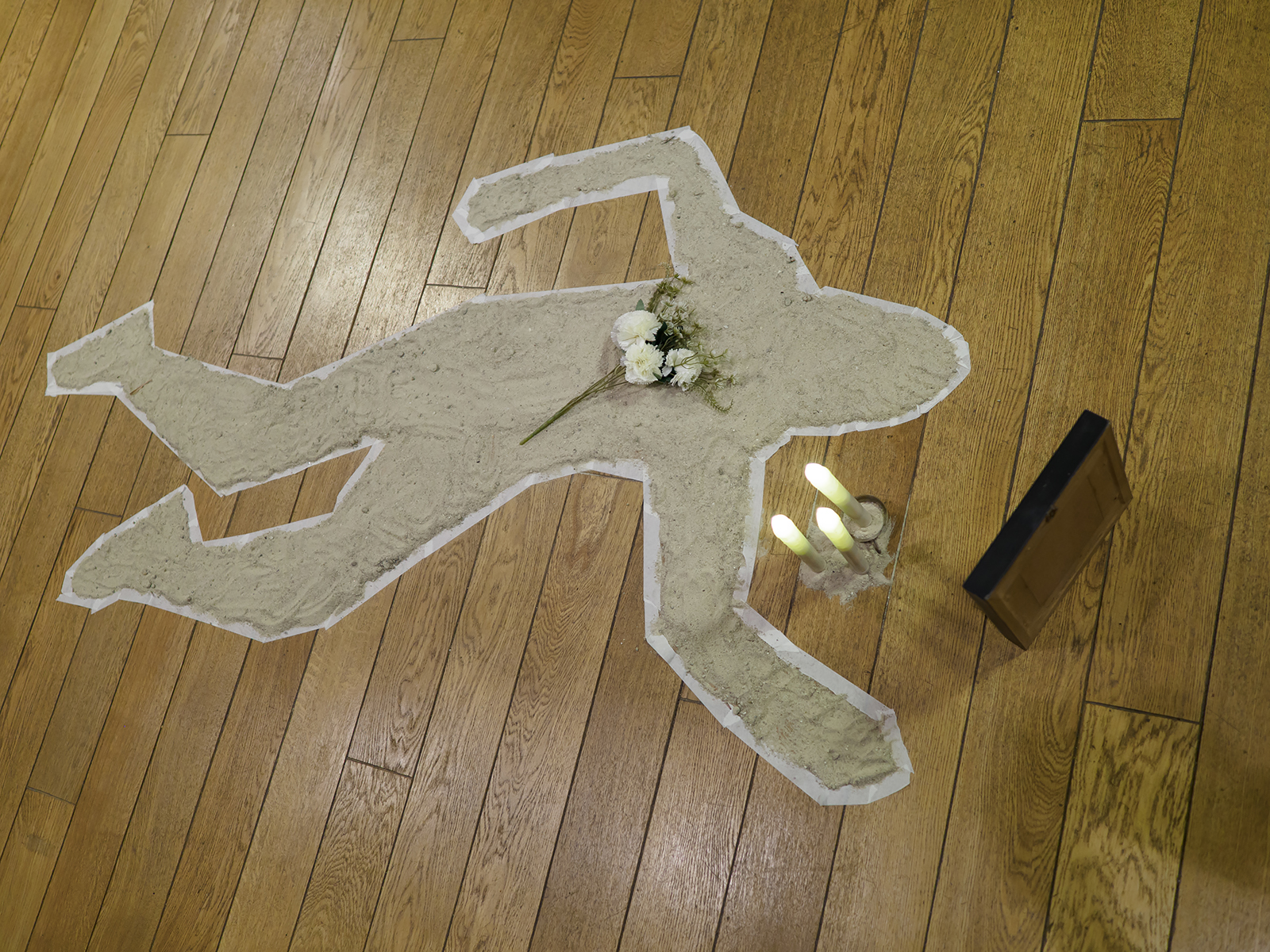 На полу цокольного этажа в фойе – фигура умершего человека из песка и бумаги, рядом букет цветов, свечи и распятие. Здесь же появляется рассказчик, а потом и ростовщик – безутешный муж погибшей женщины. Все они скорбят и потихоньку приглашают зрителей в зал.