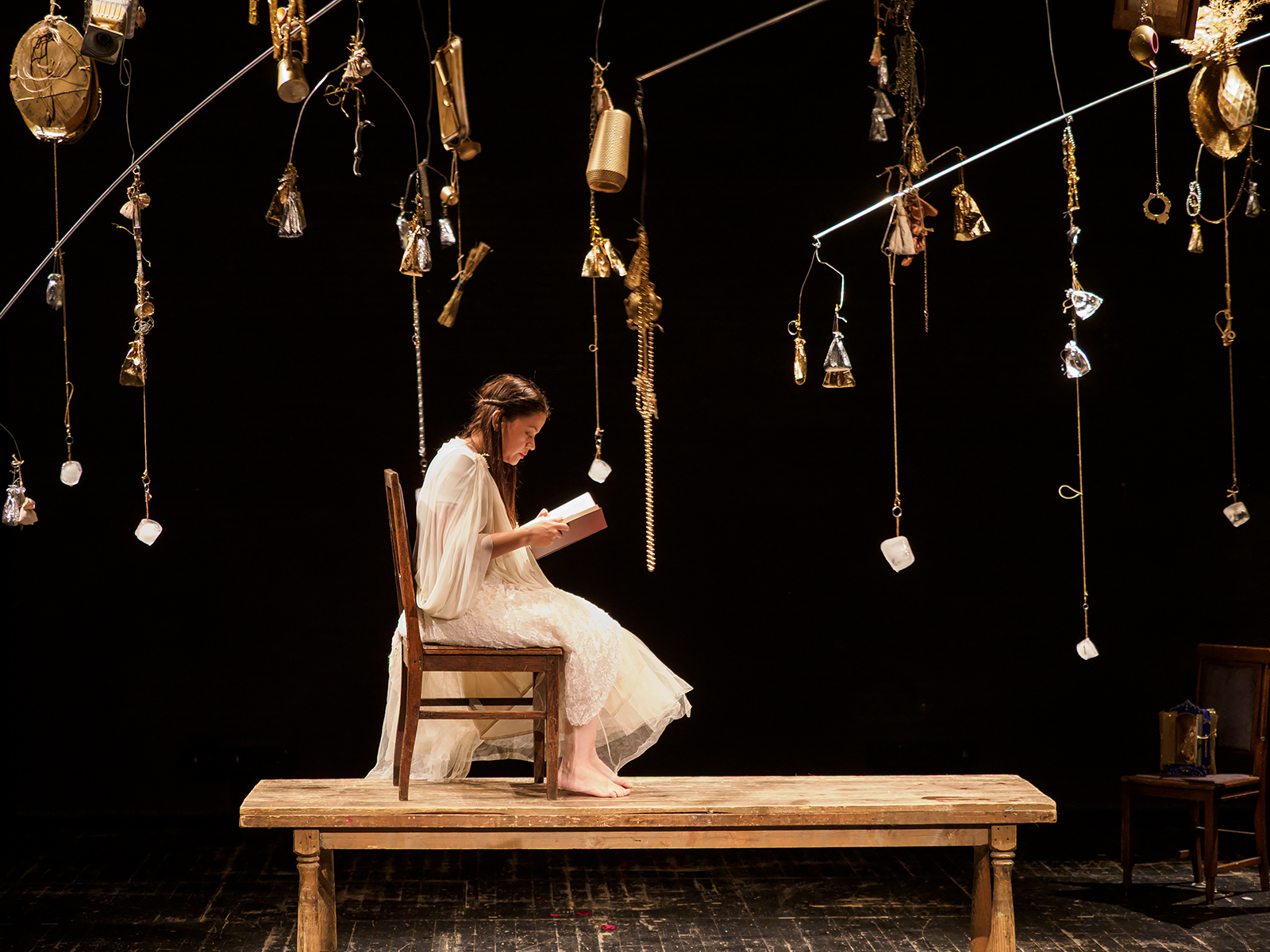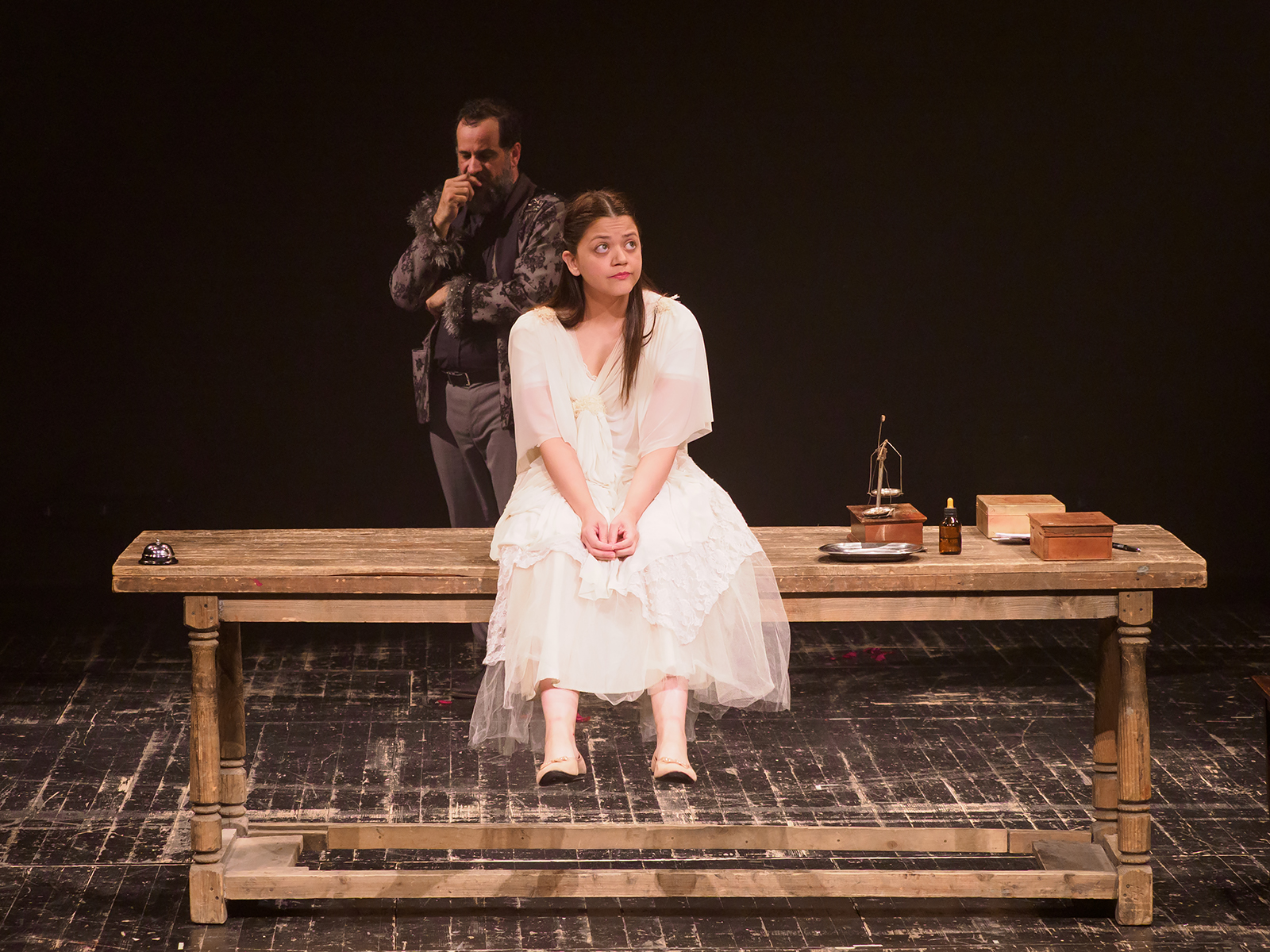 В итоге ростовщик боготворит бедную девушку, но она уже не готова быть с ним. Интересно символически показано возвышение героини: в конце спектакля мужчина ставит для нее стул на стол, будто делая ее своей правительницей, и постоянно целует ей ноги. Перемена чувствуется и в состоянии персонажей. Героиня ходит по краю стола, и здесь можно увидеть еще один символ – она как над пропастью жизни или уже стоит перед открытым окном, из которого вот-вот шагнет в смерть.