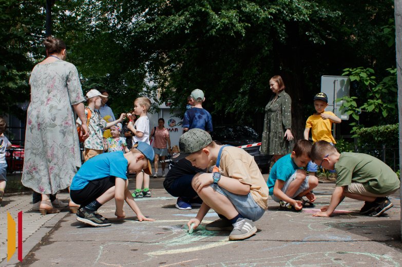На уличной площадке центра организовали целую изостудию – детям дали цветные мелки, и они стали рисовать на асфальте солнце, облака, радугу, маму и папу. Всем желающим на входе выдавали соленый и сладкий попкорн, который готовили здесь же.