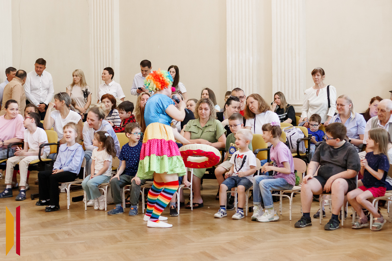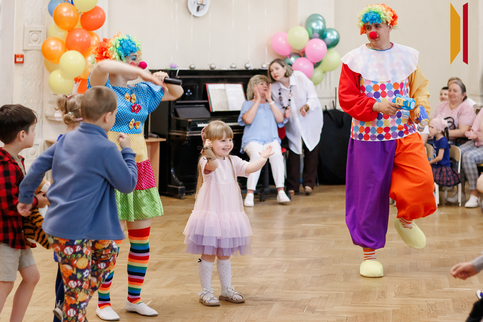 После этого на сцену вышли клоуны с анимационной программой, которая включала в себя зажигательные танцы и игры со зрителями. Клоуны бросали в зал надувной мяч, а зрители активно возвращали его обратно. Участие в игровой программе принимали как сами ребята, так и их родители.