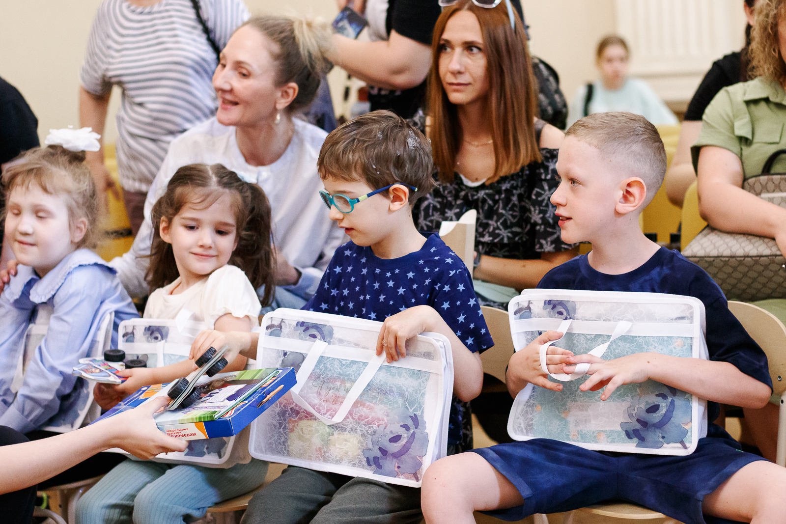 Далее клоуны провели шоу гигантских мыльных пузырей разных форм и размеров. В завершение ребятам выдали подарки – творческие наборы для раскрашивания, книги и другую полезную канцелярию.