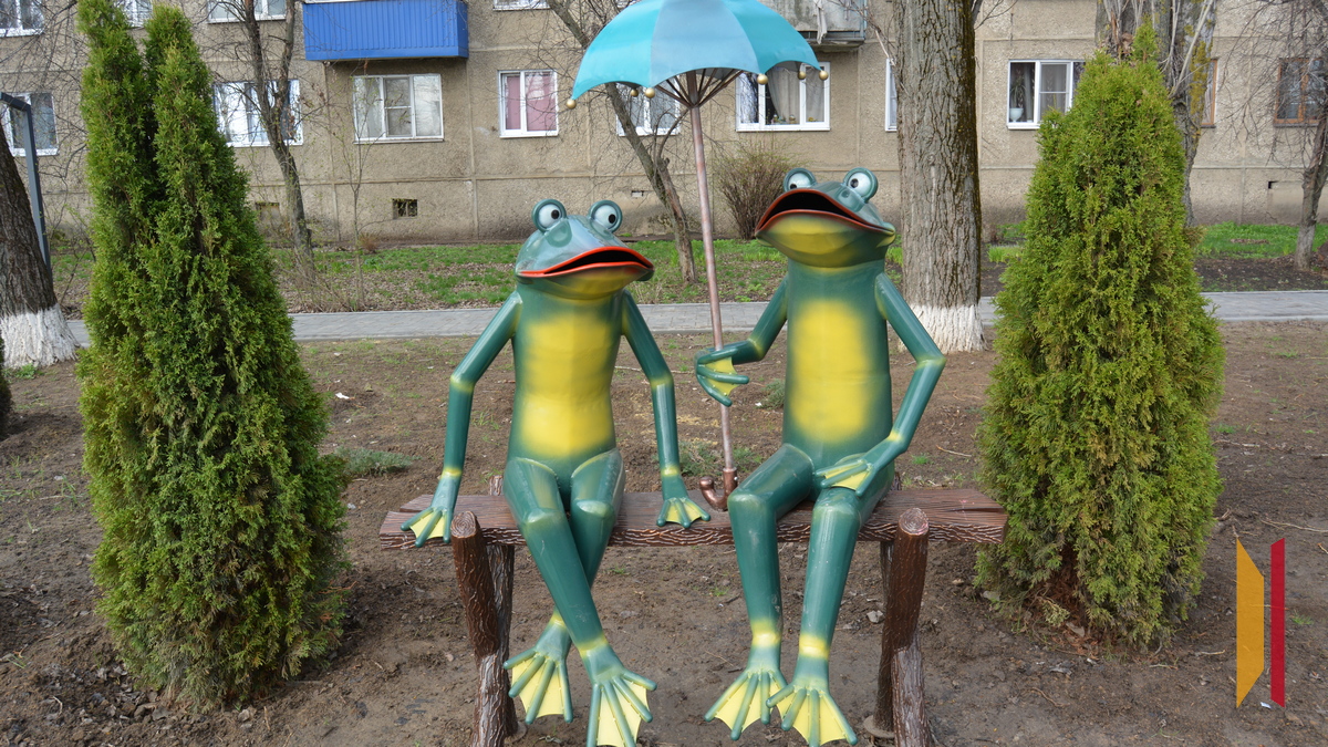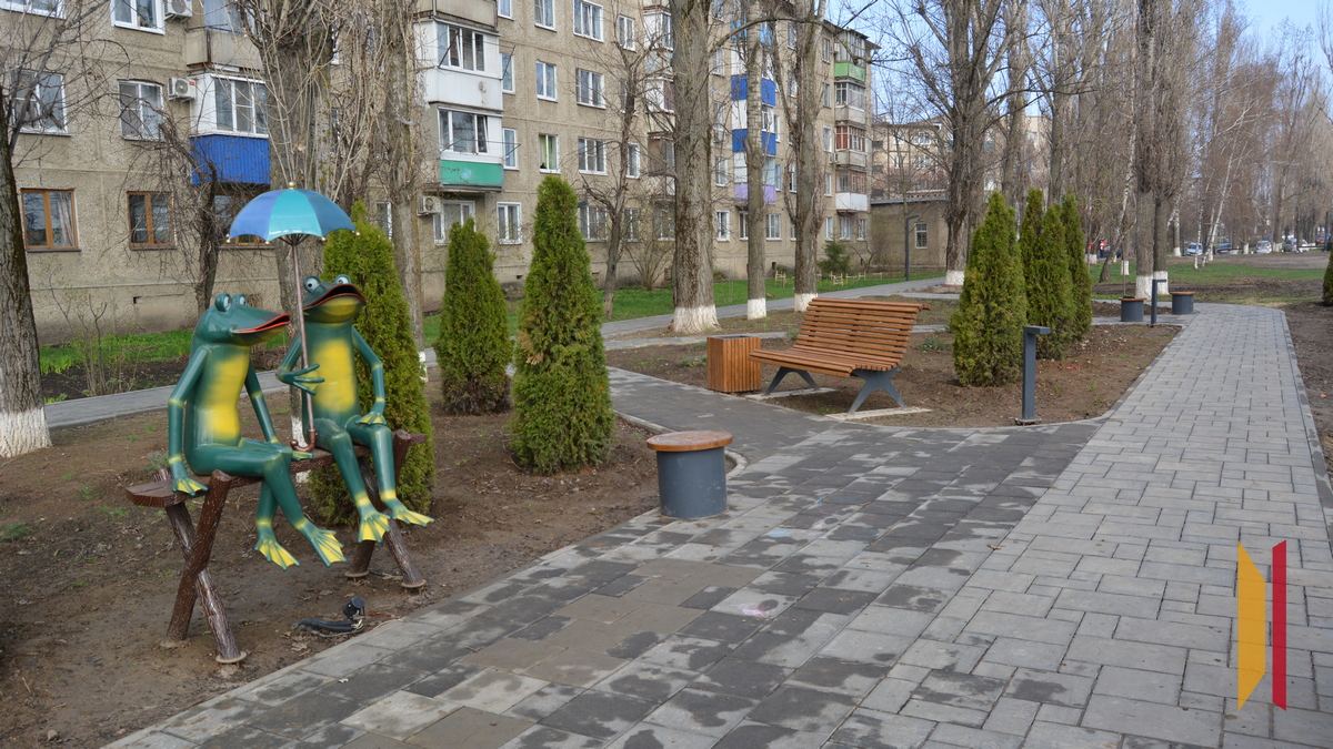 Здесь проложили дорожки, установили скамьи, урны, фонари и арт-объект – двух лягушек, сидящих на лавочке под зонтом. Скульптуру из металла выполнили местные умельцы из ремонтно-монтажного управления по заказу городской администрации. Вечером лягушки подсвечиваются фонарем с зеленым светом. В парклете высадили хвойные и лиственные деревья и кустарники. Зону отдыха от дороги отгородили вечнозелеными деревьями и липами, а на клумбах посадили туи и можжевельники.