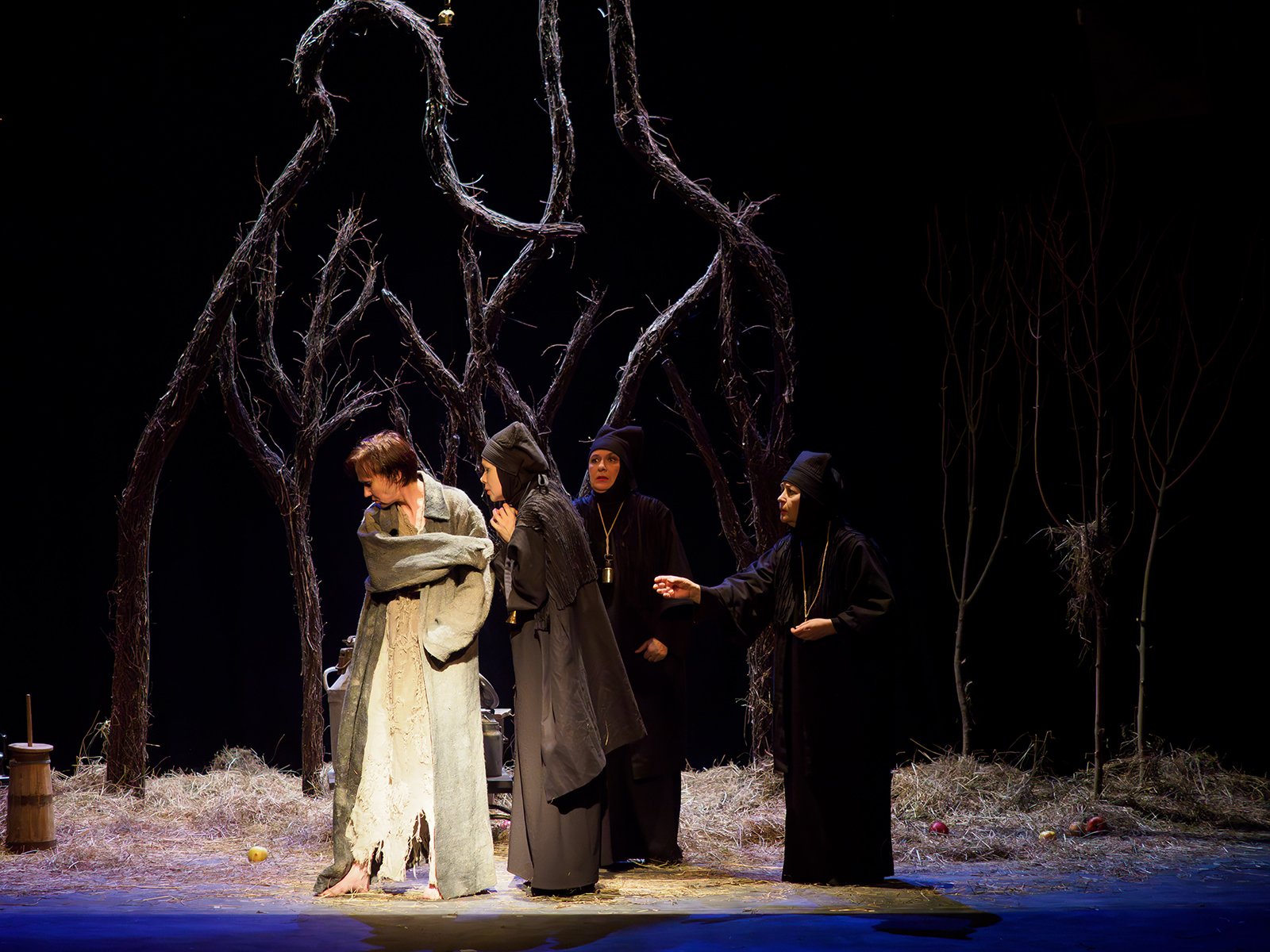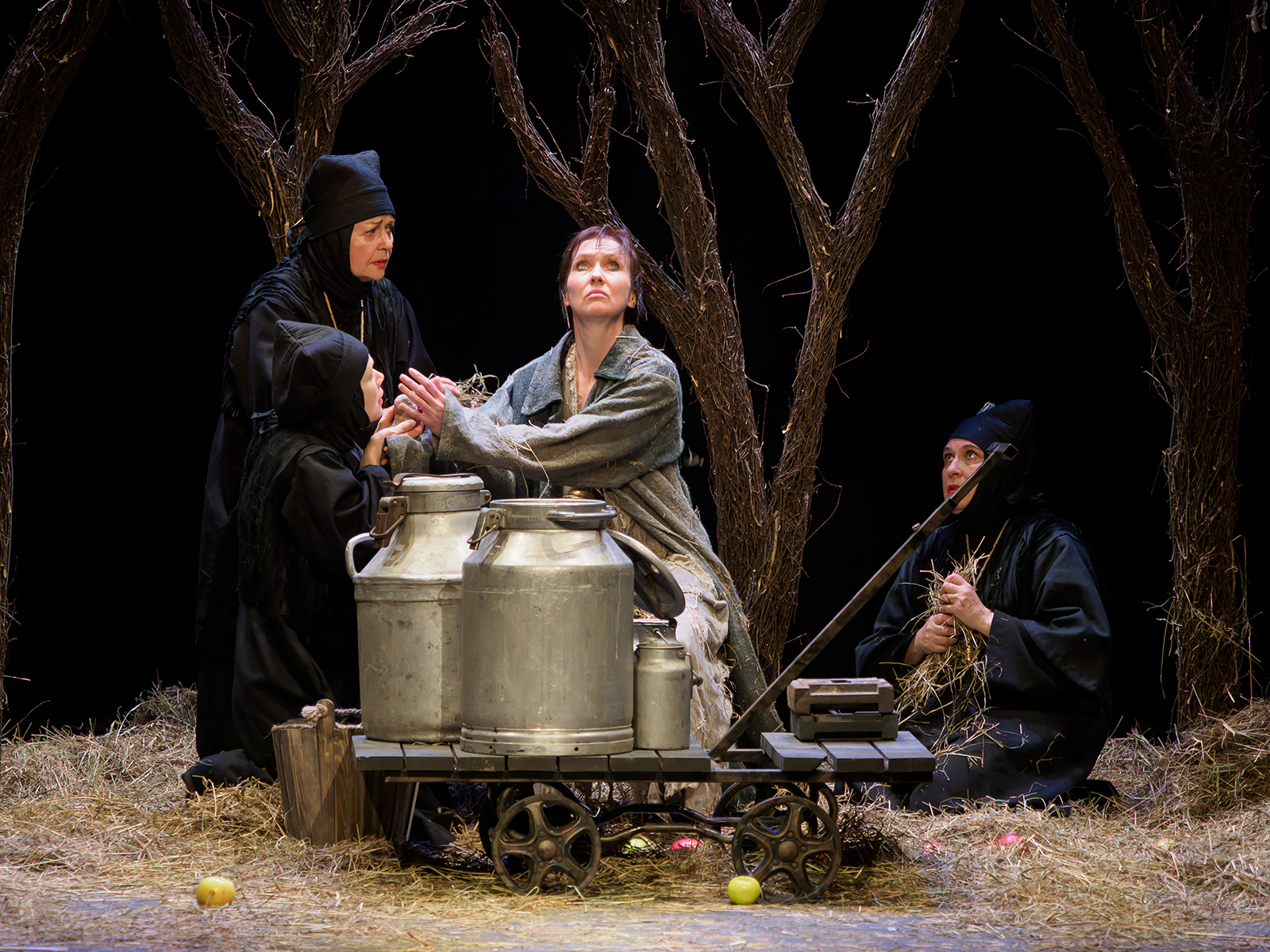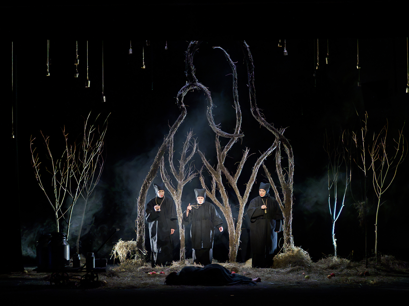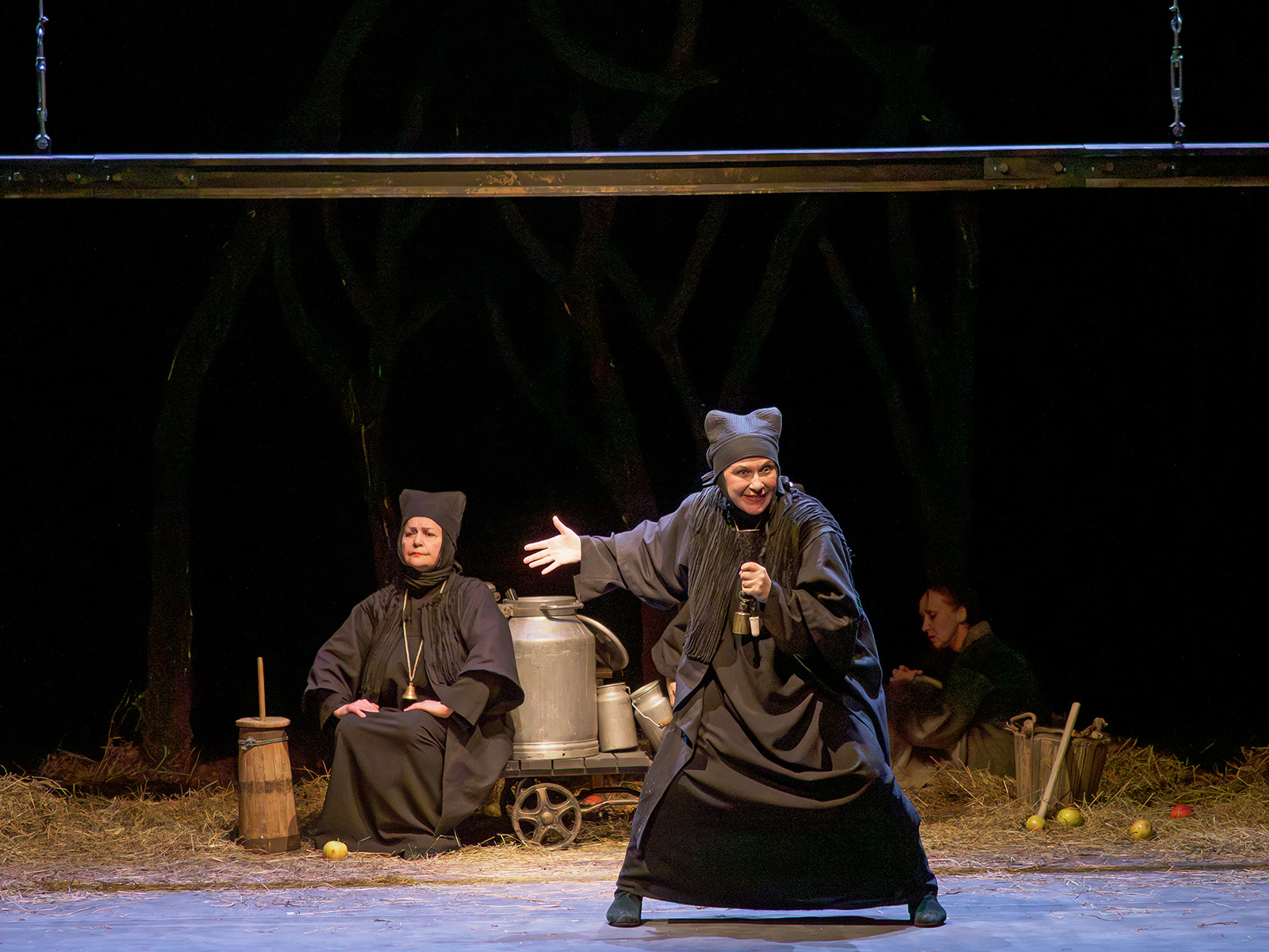 Оставить чувства, смириться с горем и продолжить жить как раньше Корову упрашивают мойры – в древнегреческой мифологии так называют греческих богинь судьбы, которые управляют людскими жизнями. В спектакле они представляют собой женщин разного возраста в черных костюмах с импровизированными рогами на голове.