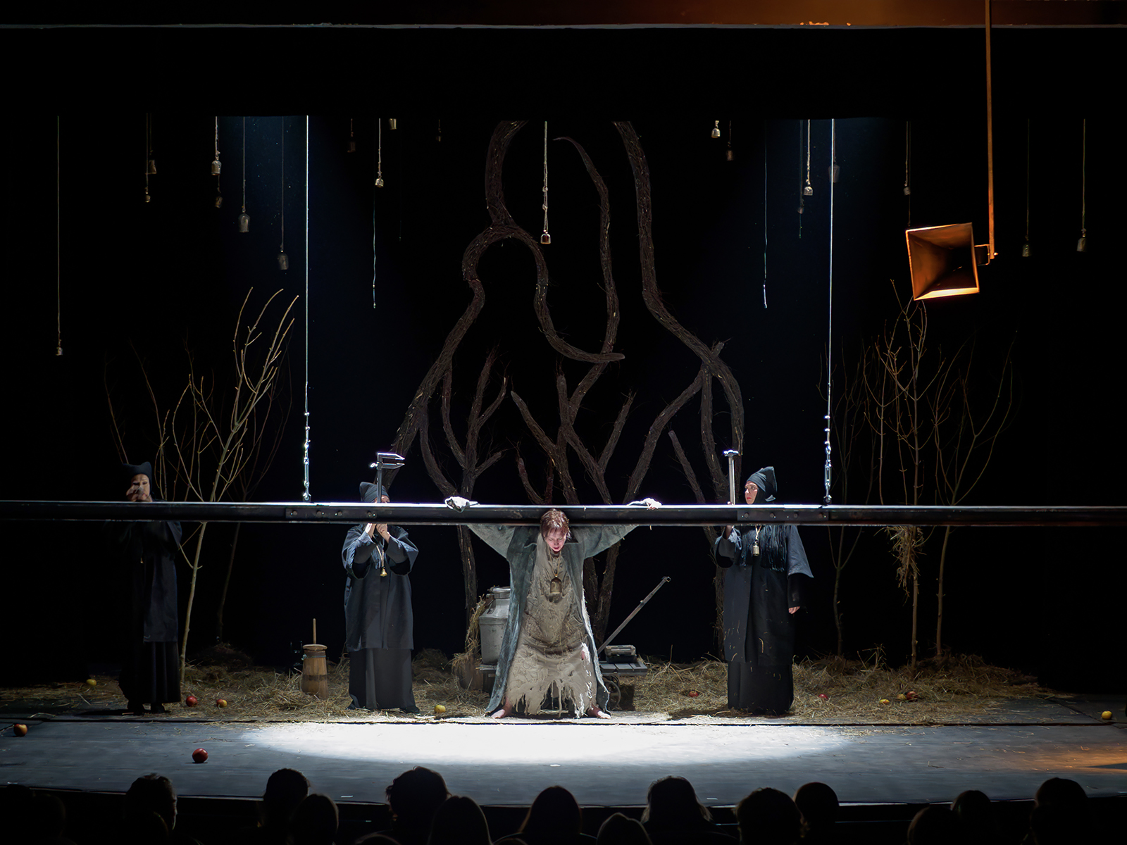 В спектакле нитью судьбы служит колокольчик, носимый Коровой на шее. После своей гибели она сама снимает его и привязывает к веревке. Символ жизни уносится к небу, где присоединяется к тихому перезвону других душ-колокольчиков, в том числе и ее сына.