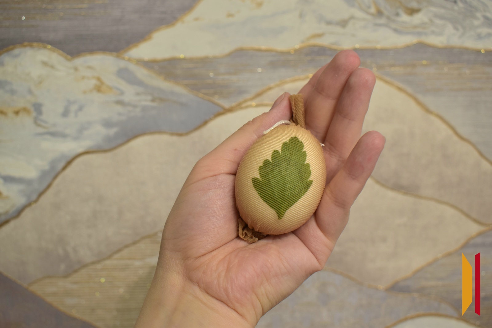 Самый популярный способ декорирования яиц, который нередко применяют вместе с окраской луковой шелухой, делается при помощи простых листиков. Для него нам понадобятся любая зелень – укроп, петрушка, кинза, – и капроновые чулки и нитки.