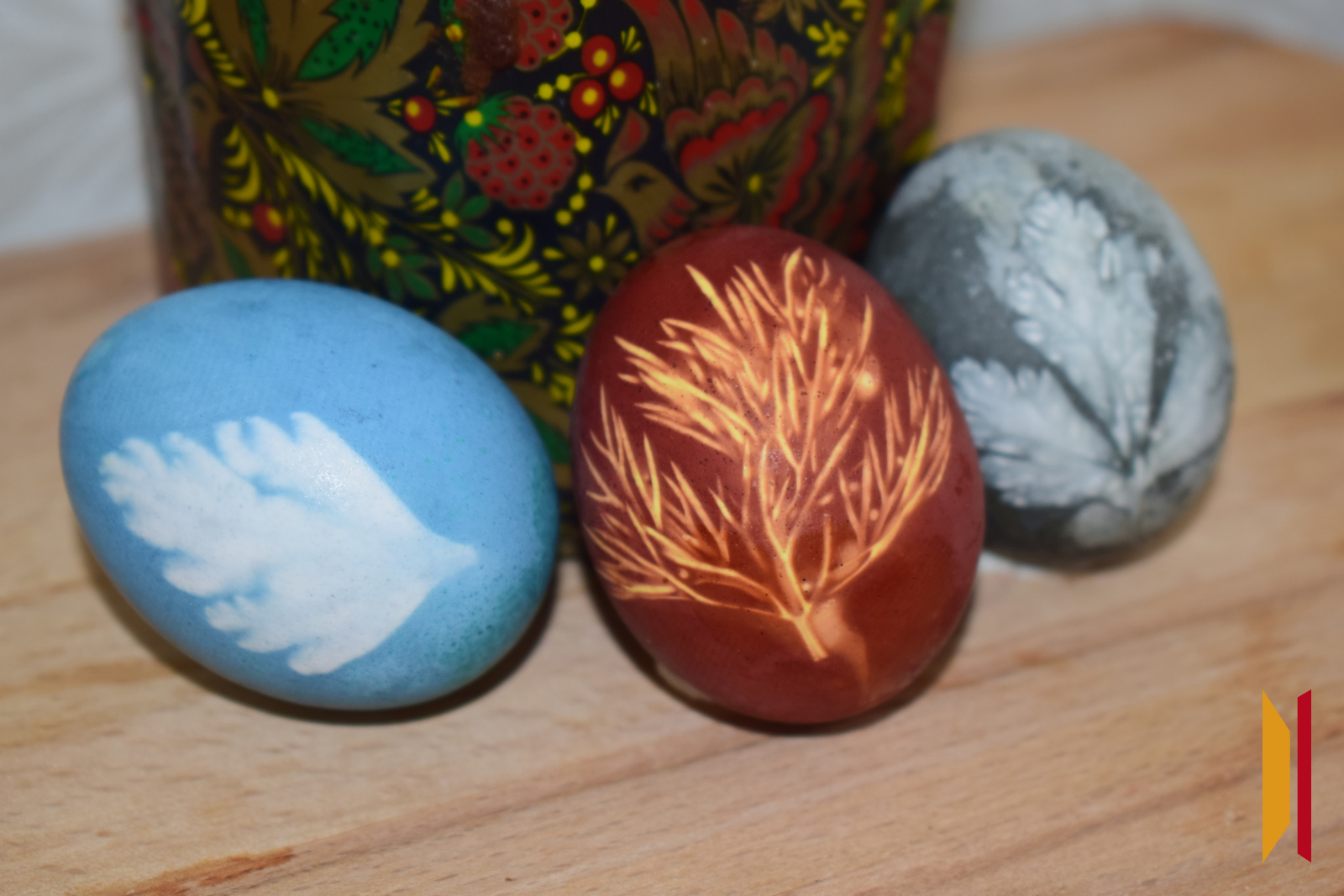 Понравившиеся листики отделяем, промываем под проточной водой. Прикладываем к отваренному яйцу и помещаем в отрезок капронового чулка. Натягиваем и плотно перевязываем концы ниткой. Далее вы можете следовать любому рецепту окраски куриных яиц. После приобретения цвета символ Пасхи можно освободить из чулка и удалить листик.