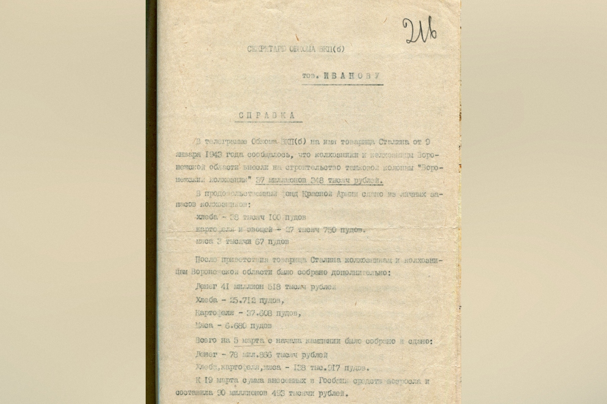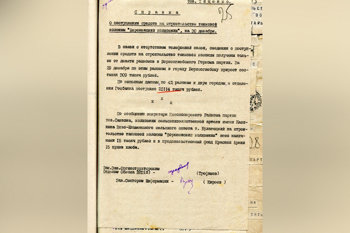 Докладная записка от 12 декабря 1942 года: «Секретарю обкома ВКП (б) тов. Тищенко. Информация о сборе средств на строительство танковой колонны «Воронежский колхозник».