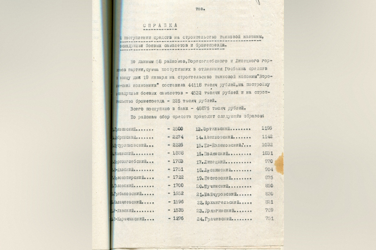 «По данным, полученным от партийных комитетов, сумма собранных на постройку танковой колонны средств характеризуется по районам следующим образом (в тыс. руб.): Таловский – 700, В.-Карачанский – 400, Байчуровский – 350, Борисоглебский – 250, Архангельский – 120, Р.-Хавский – 100, Полянский – 97, Алешковский – 90, Аннинский – 76, Е.-Коленовский – 60, Абрамовский – 65, Песковский – 27, Грибановский – 18». Из остальных районов сведения не поступили в связи с отсутствием телефонной связи.