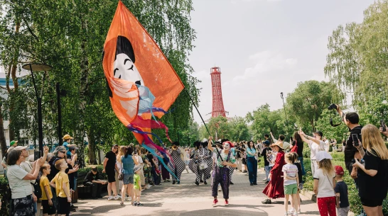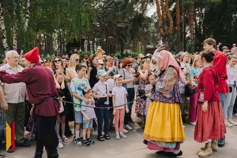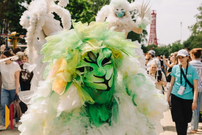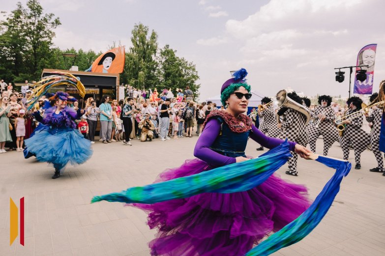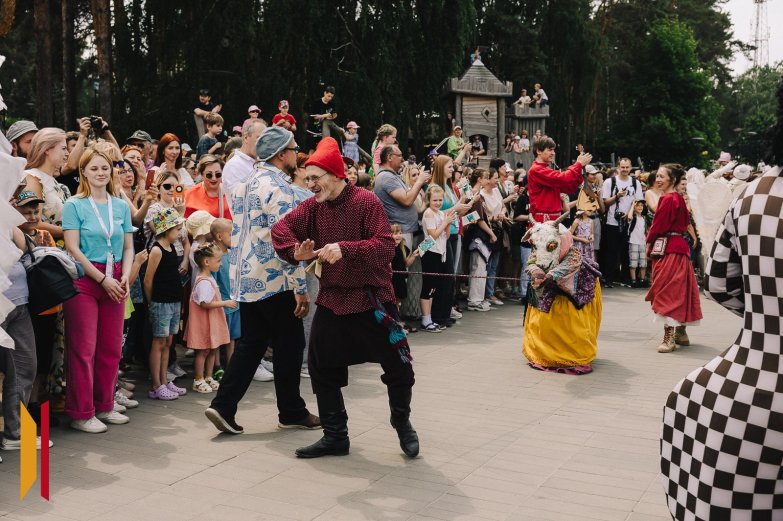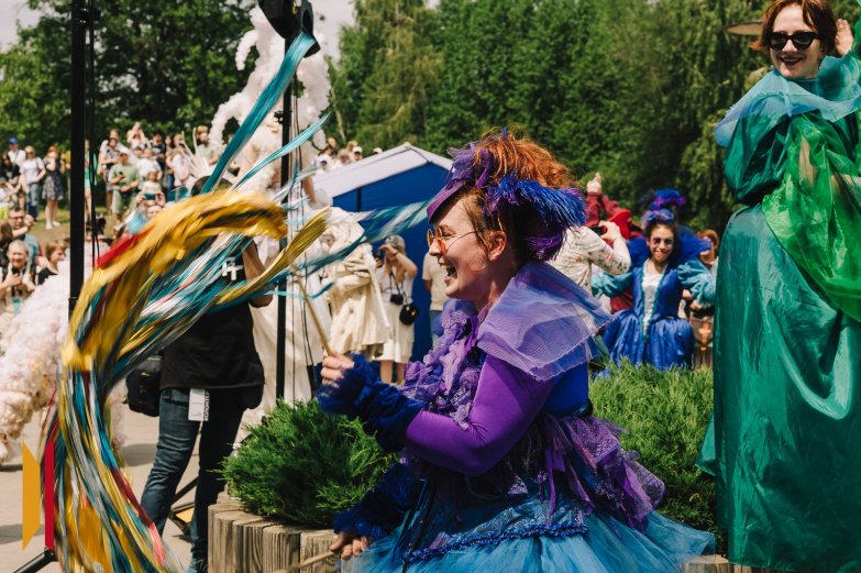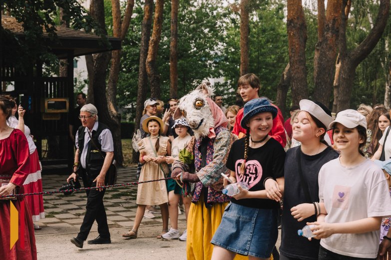 Следом шли ходулисты из самарского театра «Пластилиновый дождь», с ними же катился огромный велосипед. Они показали гостям фестиваля спектакль-променад «Между завтра и вчера» (6+). Замыкали шествие под русские народные песни артисты театра «Небесная карусель».