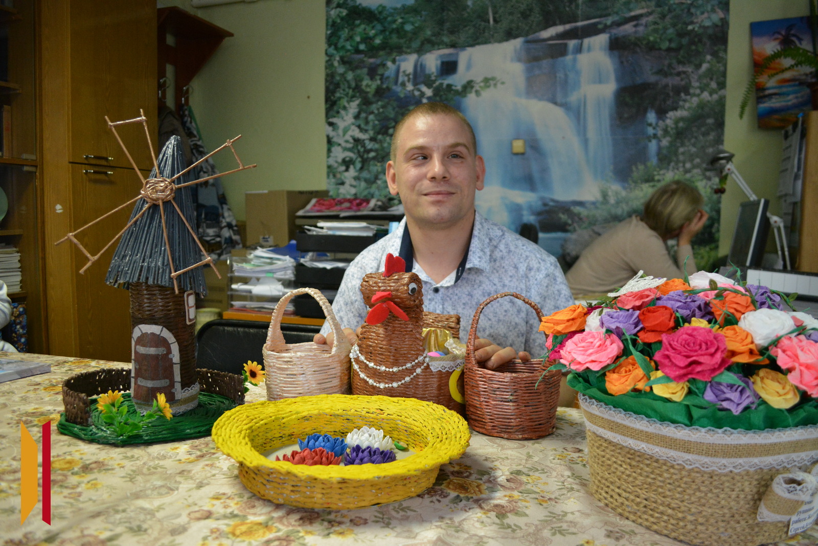 Виталий Бутырин виртуозно накручивает бумажную соломку из газетной бумаги и создает бумажные шедевры: корзинки, лукошки, мини-артобъекты. А также умеет работать с джутовой тесьмой. Это кропотливое творчество вместе с подготовкой материала, плетением и последующей обработкой изделия занимает у мастера месяц. Готовую вещь он закрепляет лаком в несколько слоев, чтобы придать ей прочность. Его авторские работы представляют социальный центр на областных и районных смотрах.