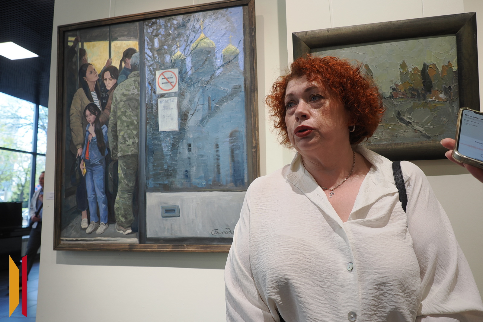 Художница рассказала, что картина символизирует подавленное состояние людей в движущейся маршрутке. Людям не хватает духовности. Когда автобус проезжает мимо храма и пассажиры видят его в окне, перед ними возникает выбор – ехать дальше или выйти на этой остановке. Светлана Володина добавила, что очень рада стать участницей выставки.