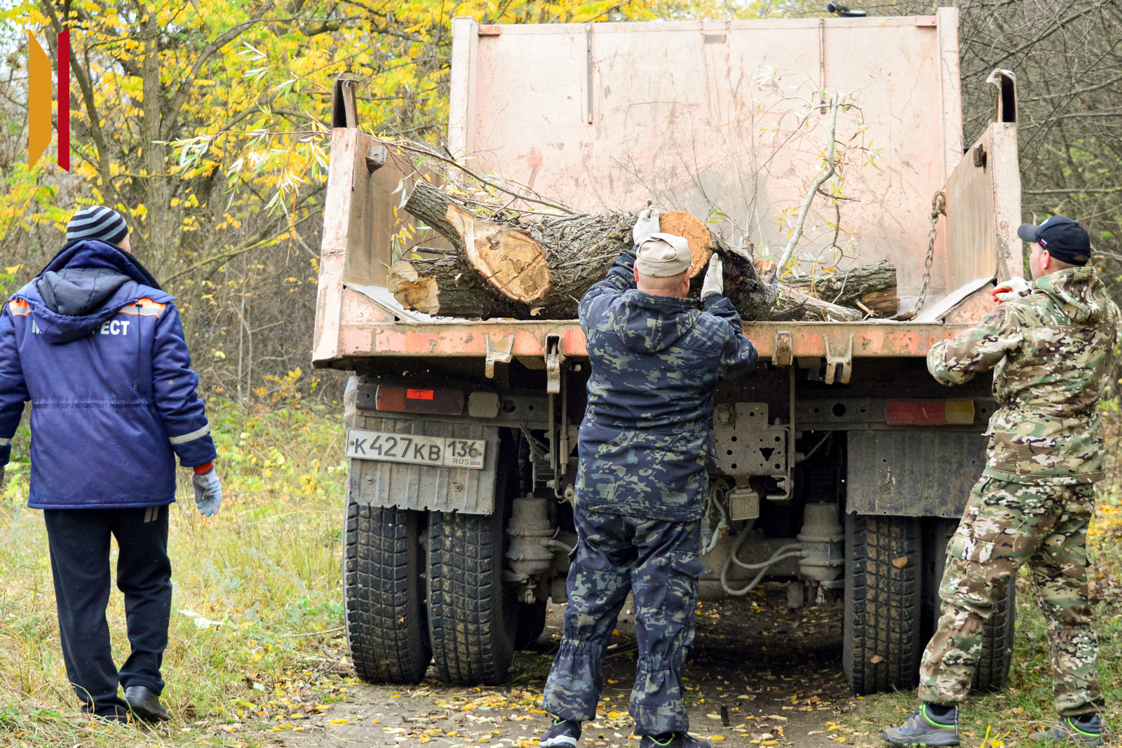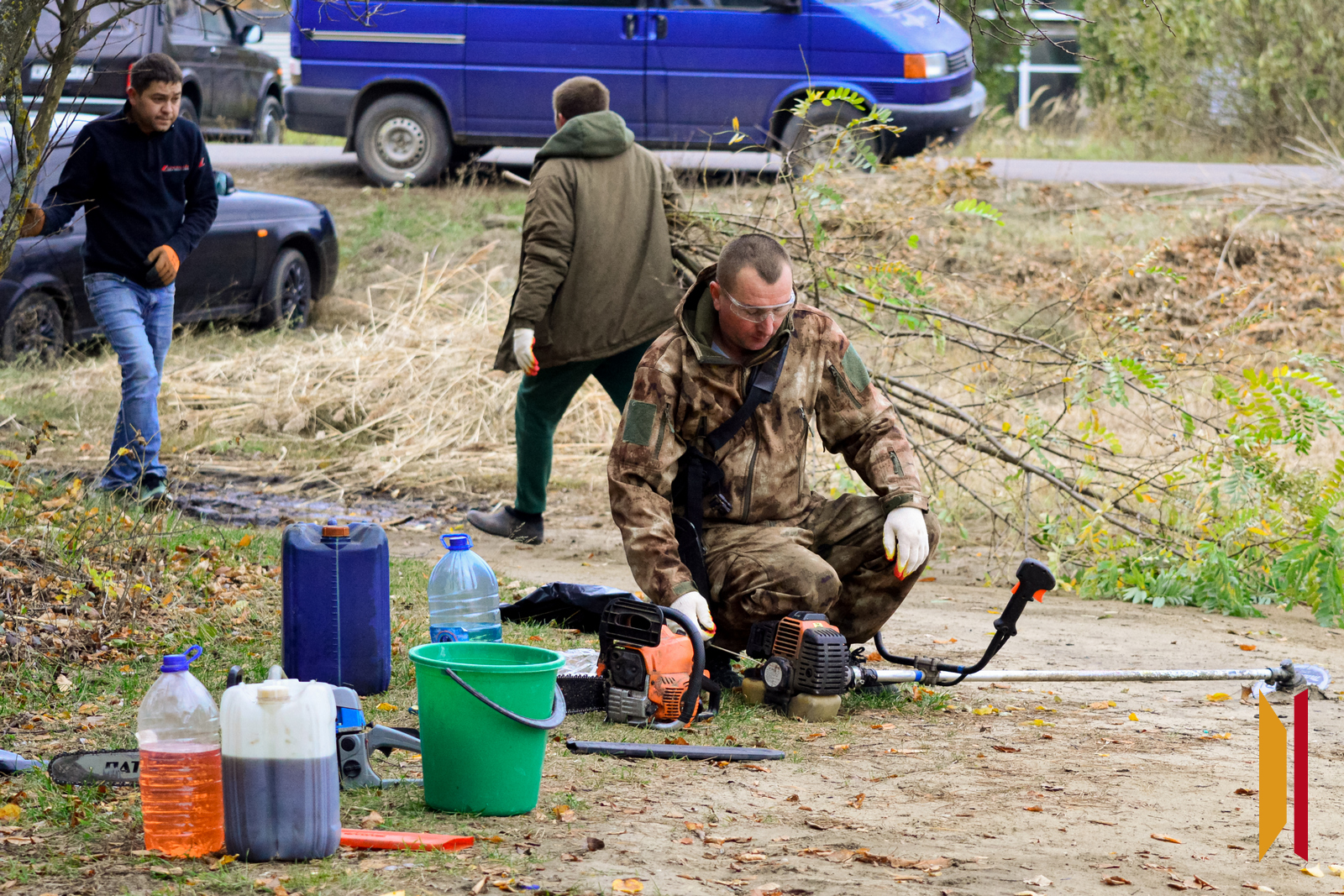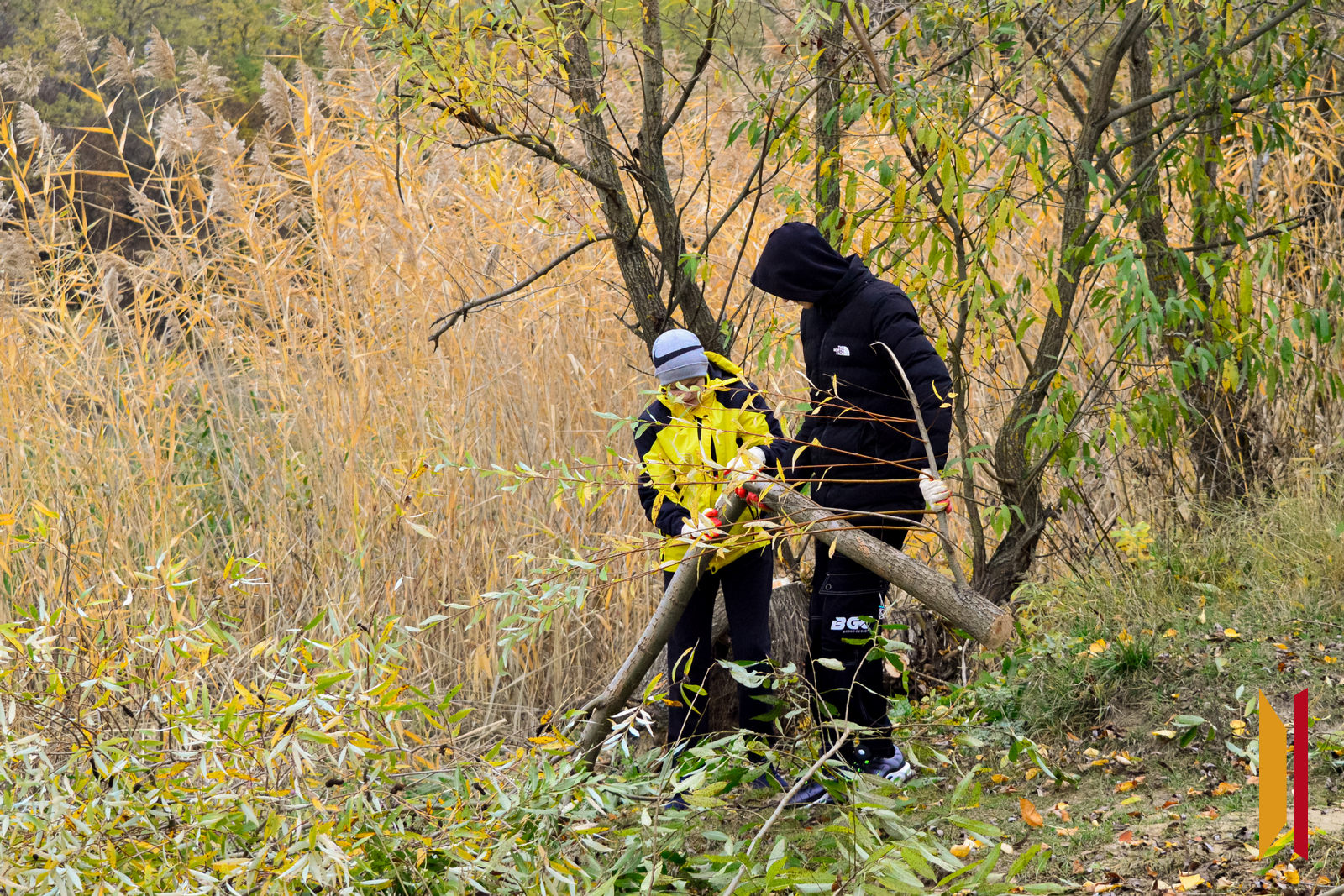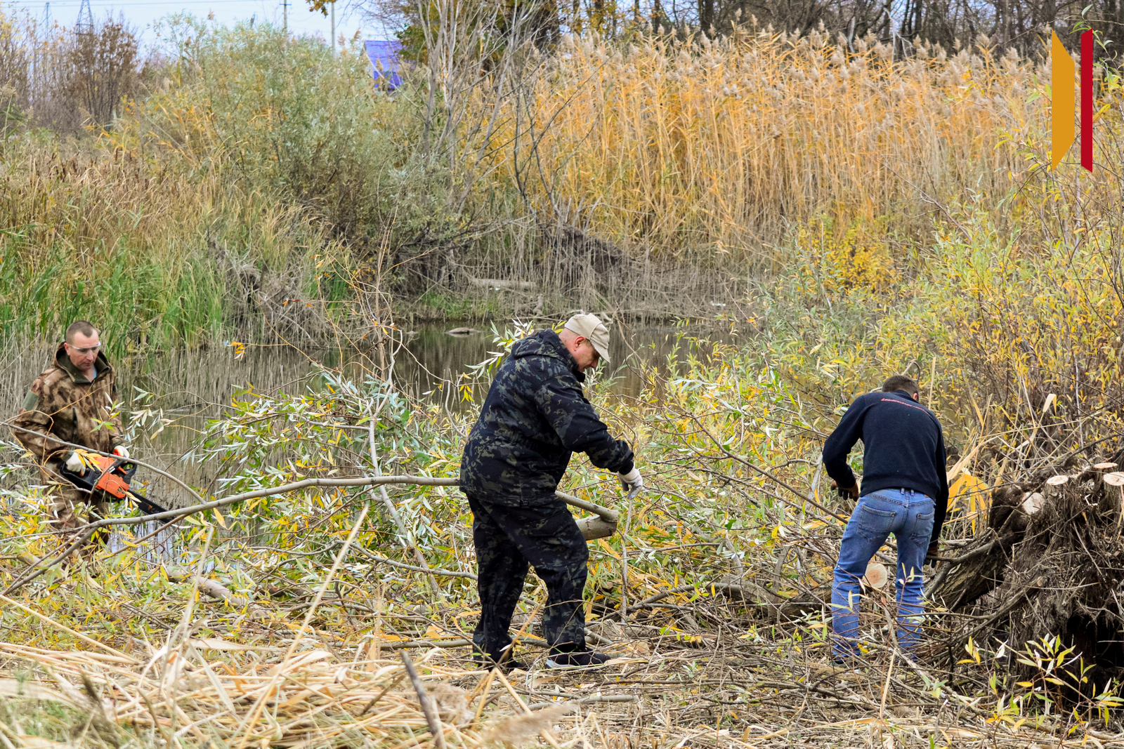 Братья Андрей и Дмитрий хотя и не любят рыбачить, но пришли поддержать своего отца – Владимира Радченко. Он бензопилой очищал берег от кустарников и деревьев, а сыновья относили спиленные ветки к подъехавшему грузовику.