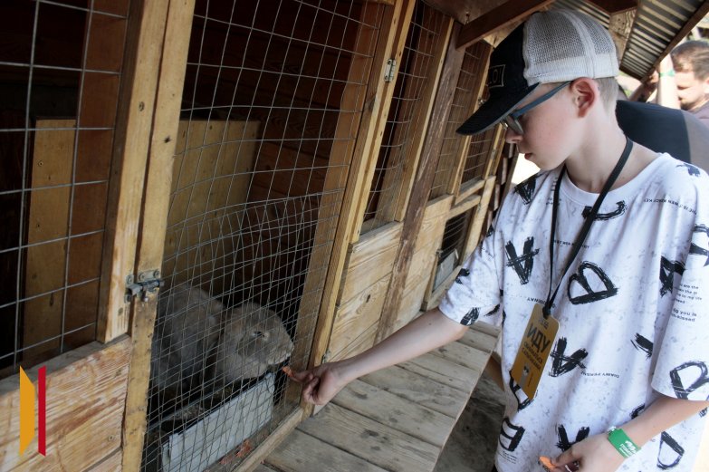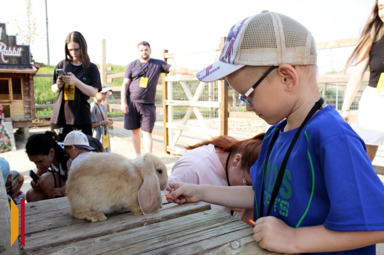 После дети покормили козочек и больших серых вислоухих кроликов породы французский лоп. Ребята попробовали поднять маленьких козлят, но не всем это оказалось по силе, тем не менее ушли с положительными эмоциями от контакта с животными. На выходе ребят ожидал однорогий шотландский бычок Шериф, который как-то в выходной день снес ограду загона и потерял рог.
